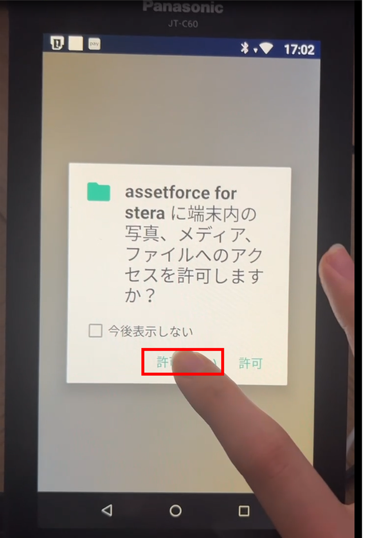 アプリを起動しようとすると、エラーメッセージ「権限が許可されていません」と表示されて、アプリが起動しない場合assetforce for steraのアプリ初回起動時に表示される下記のメッセージで「許可しない」を選択している |